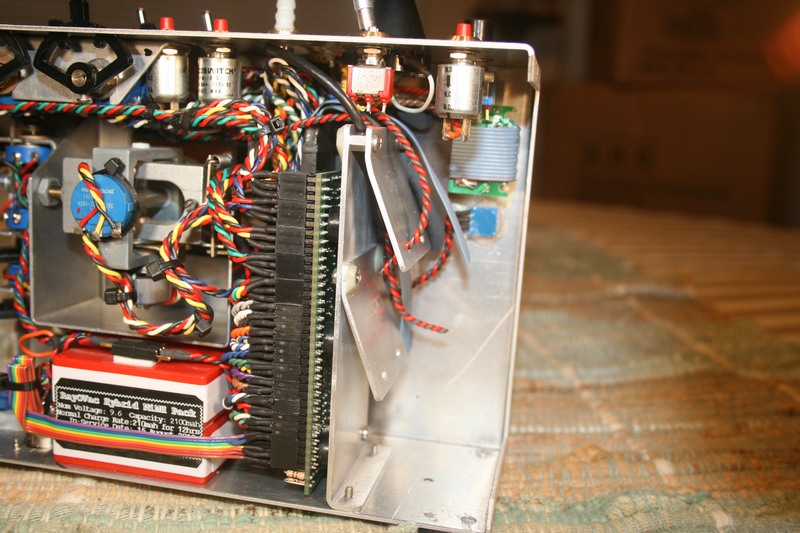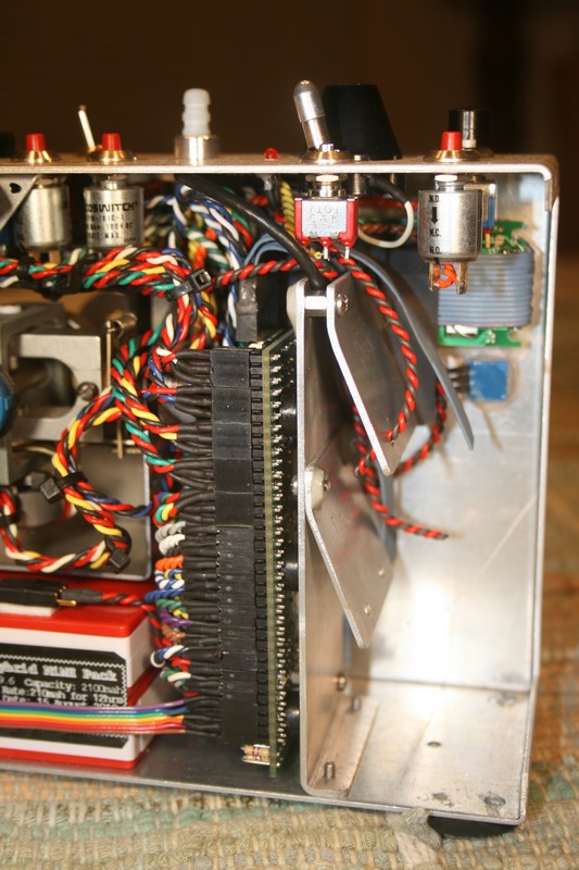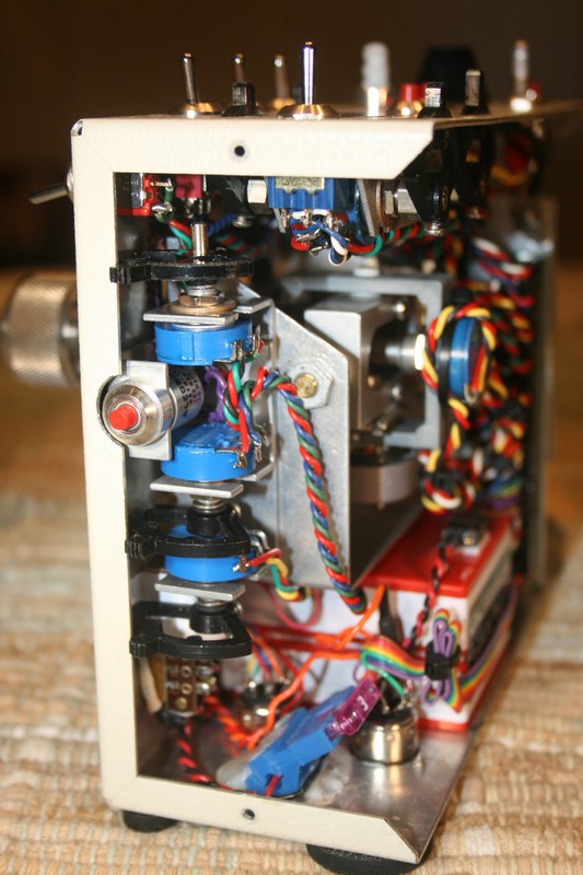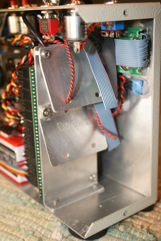 Kees asked me to update his old friend to include two 6 meter GAACE RF decks. Refreshed the stick assembly with Vishay 157 pots, new springs and spacers. Added new switches and some new features he requested. Kees wanted to build and install the RF decks hence the incomplete antenna and RF deck cable leads. He wanted nothing mounted on the case back so I had to be creative with the encoder/RF deck mount. The christmas tree arrangement is a bit unorthodox but it does the job. The gray dohickie on the case top is a screwdriver I made that fits into the display contrast hole. The ferrule it's mounted in holds the little fella tightly until it's needed.